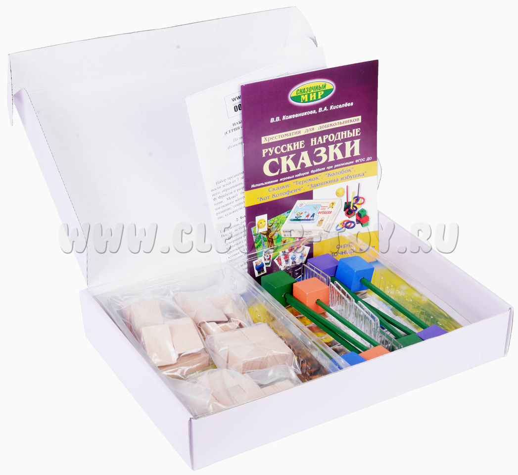 - методические рекомендации для педагогов («Хрестоматия для дошкольников “Русские народные сказки”. Использование игровых наборов Фрёбеля при реализации ФГОС ДО». Авторы: В.В. Кожевникова, В.А. Киселева – 28 страниц – печать офсетная, обложка полноцвет.) - 1 шт.