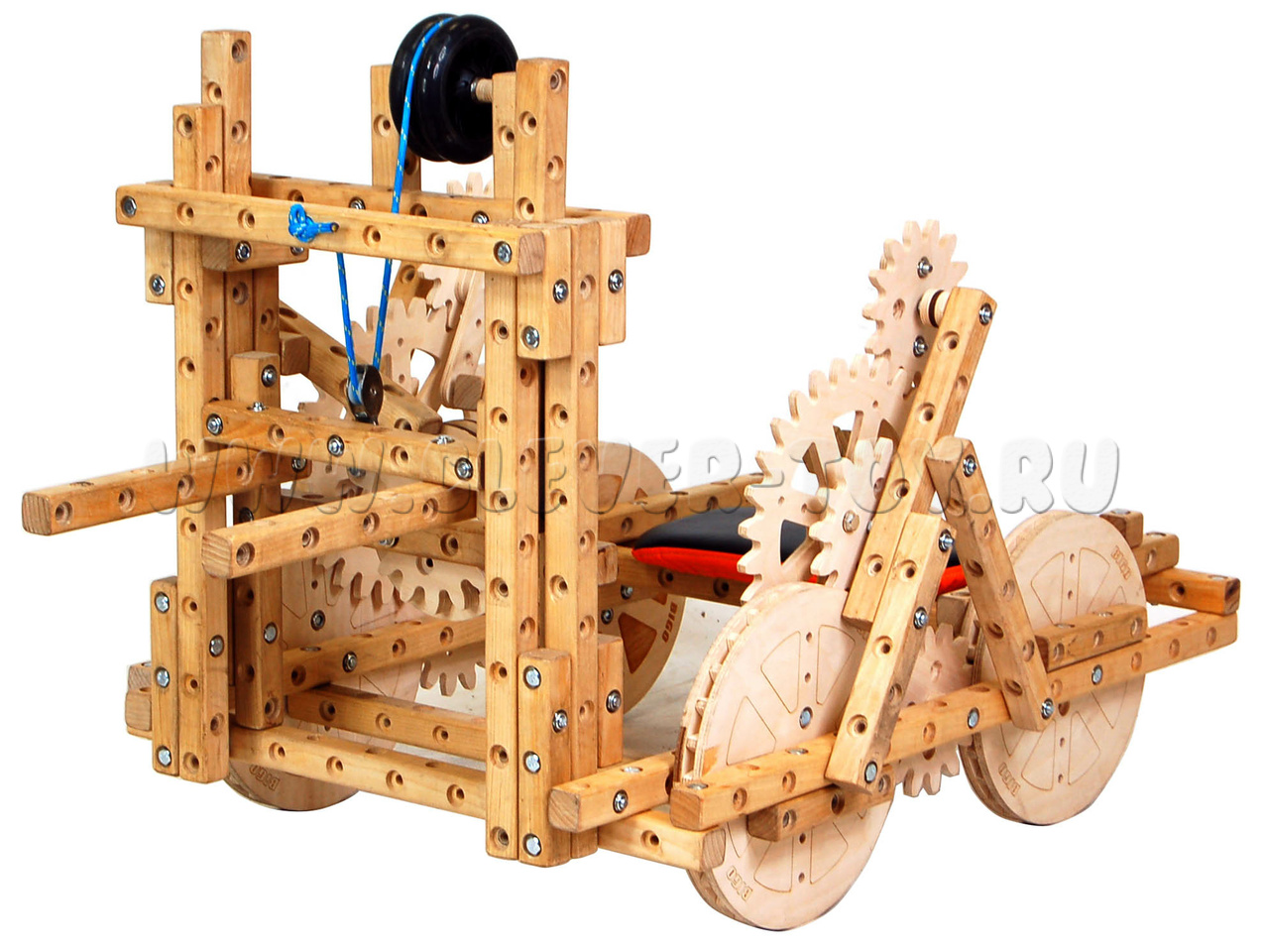 Состав конструктора “Дошкольник” включает 80 брусков из твёрдой уральской берёзы, около 300 болтов и гаек, сидушки с чехлами, колеса, шестерёнки, блок-ролики, ключи для сборки и систему хранения для мелких деталей.
