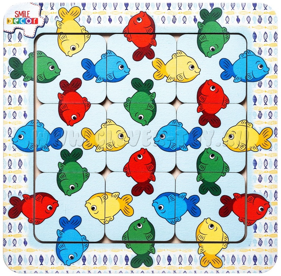 2. Игра "Собери рыбок". Достаньте несколько элементов головоломки из рамки-основания. Предложите ребенку вставить квадраты обратно в рамку так, чтобы половинки рыбок (голова и хвост) соответствовали друг другу по цвету.  Если ребенок легко справляется с заданием, то извлеките все элементы и попросите собрать рыбок в аквариуме.