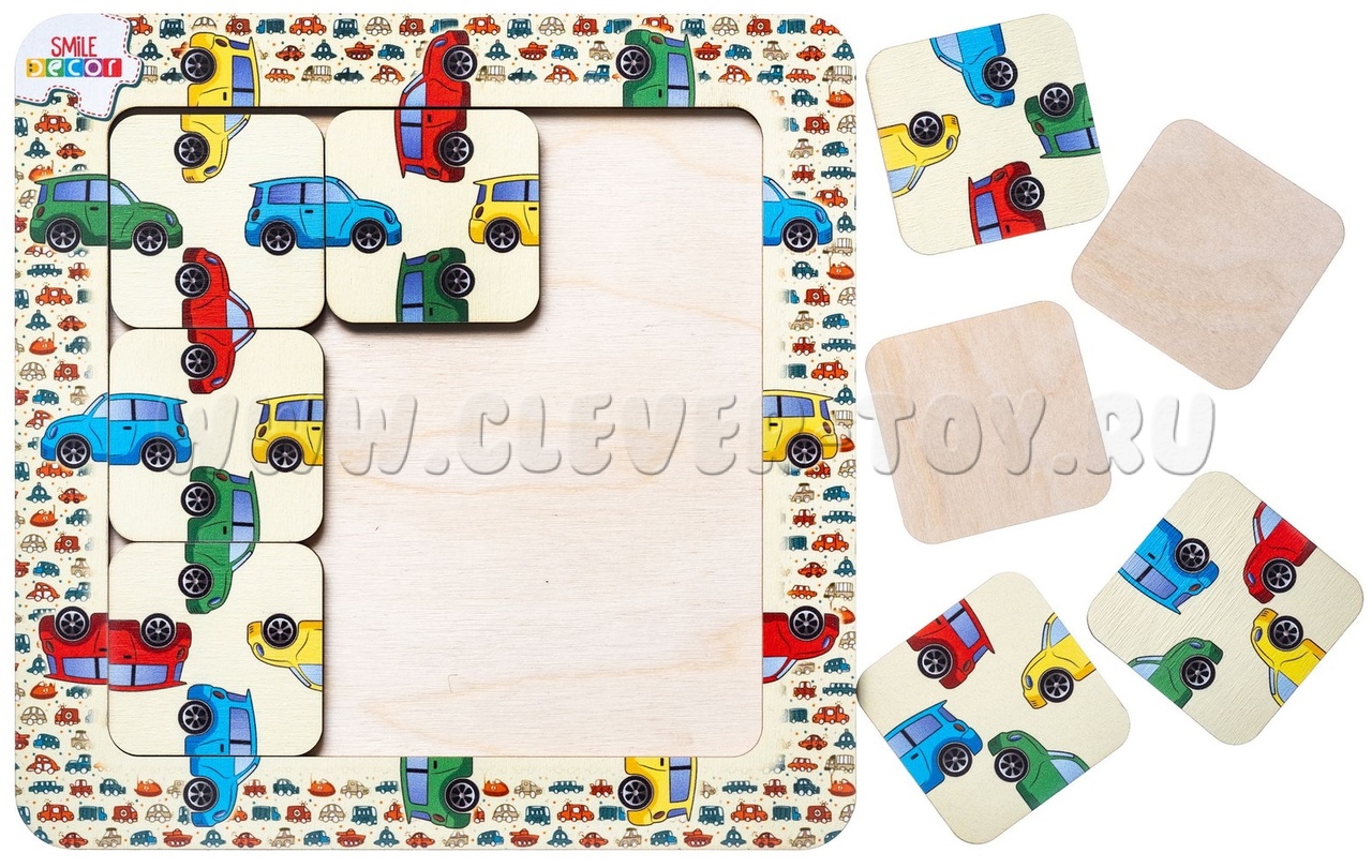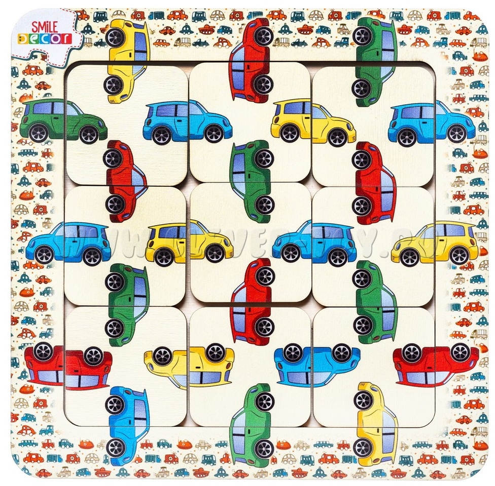 2. Игра "Автослесарь". Достаньте несколько элементов головоломки из рамки-основания. Предложите ребенку вставить квадраты обратно в рамку так, чтобы половинки машинок (капот и багажник) соответствовали друг другу по цвету.  Если ребенок легко справляется с заданием, то извлеките все элементы и попросите собрать машинки в автомастерской.