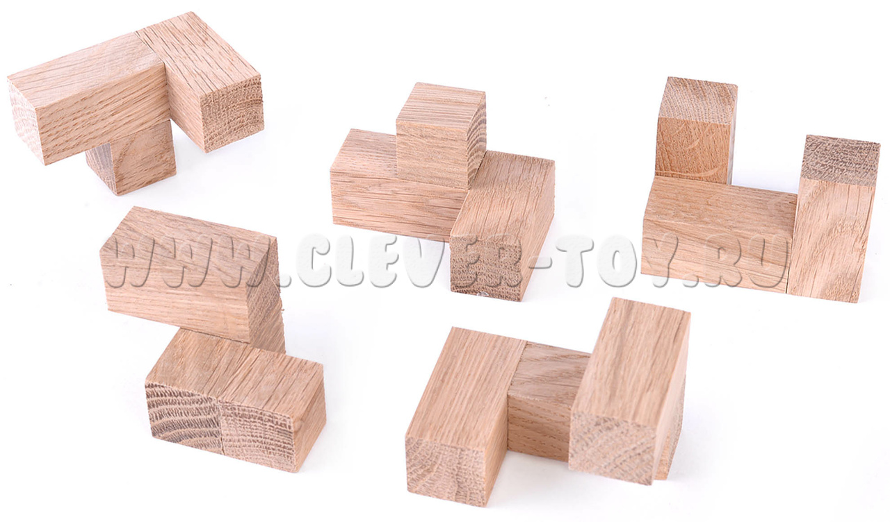 Головоломка содержит в себе две задачи. Первая заключается в том, чтобы построить симметричное тело, используя все пять элементов-кубиков. Эта задача имеет много решений и позволяет развивать воображение и творческие способности.