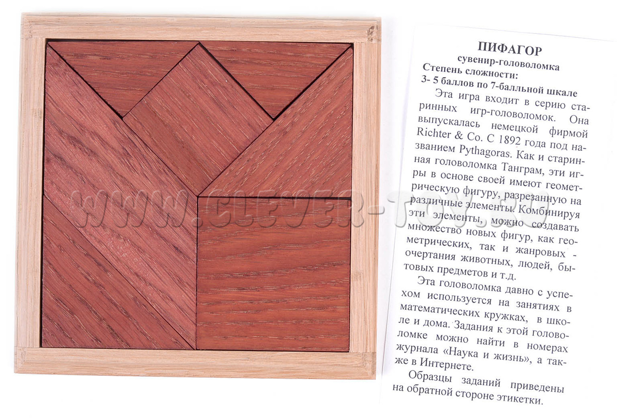 Старинная головоломка “Пифагор” хорошо подходит для развития у детей образного мышления и навыков абстрагирования. Ребята посредствам воссозданий из простых геометрических фигур людей, животных, персонажей и вещей учатся смотреть шире, что увеличивает глубину мышления.