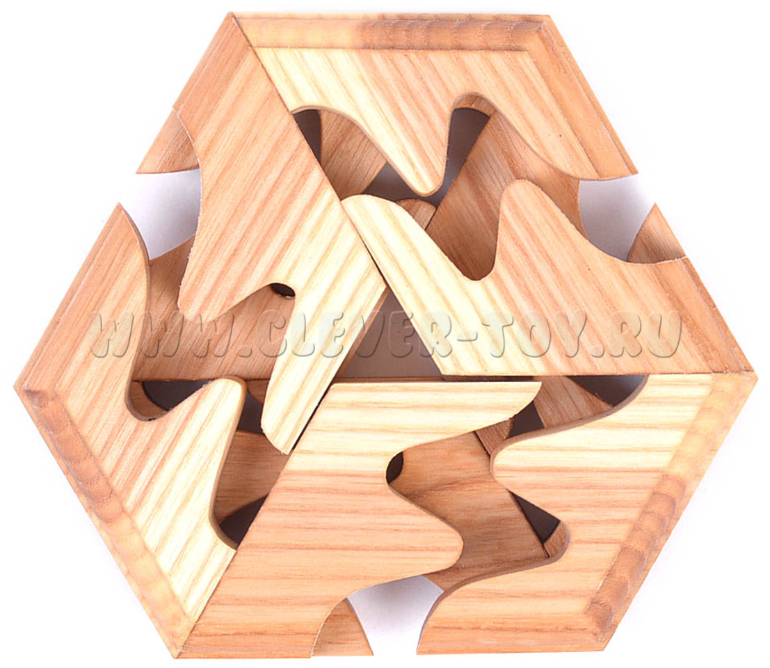 Если положить эту шестигранную призму плашмя на поверхность стола, и легонько крутануть её как волчок, то благодаря центробежным силам головоломка разделится на три одинаковые части. Попробуйте собрать из них исходное тело - это будет не так уж и просто, ведь создавать сложнее, чем разрушать.