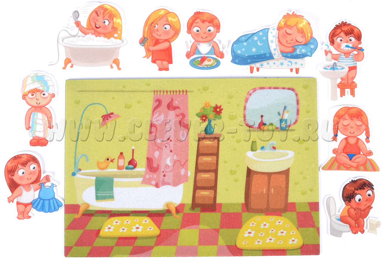 • в игровой форме познакомит ребёнка с тем, как проходит начало дня, какие гигиенические процедуры необходимо провести утром;