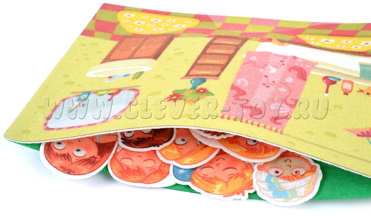 • игровое поле с изображением ванной комнаты с прорисованными деталями, в виде конверта, в котором удобно хранить игровые элементы;