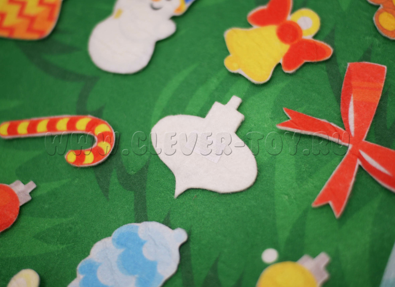 • игровые элементы из фетра – ёлочные игрушки (звёздочки, шишечки, зайчики, шарики, колокольчики, часики, бантики, леденцы).