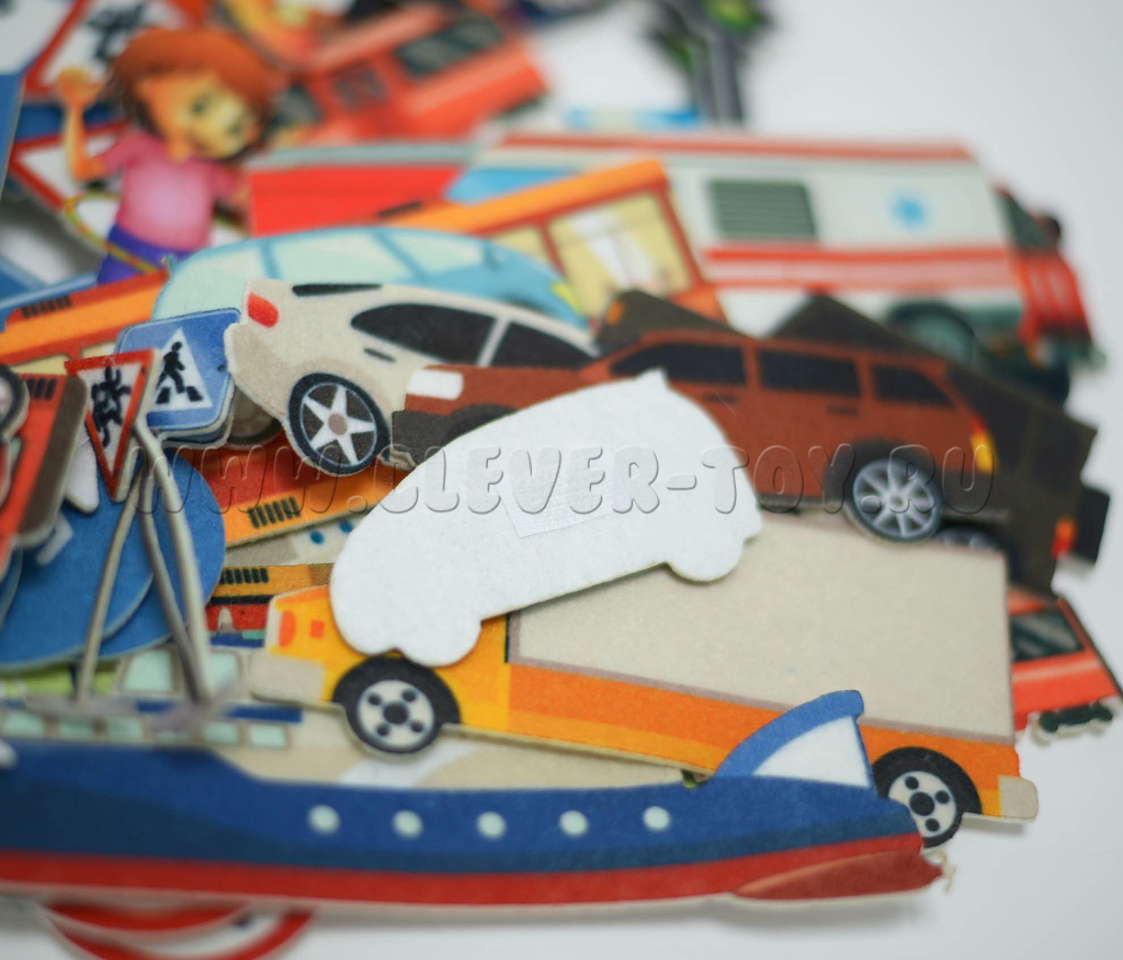 - 13 фигурок машинок и общественного транспорта: легковые и грузовые автомобили, поезд, троллейбус, полицейская машина, пожарная машина, скорая помощь, автобус; пароход и катер; более 20-ти дорожных знаков; 6 светофоров, 8 фигурок детей;