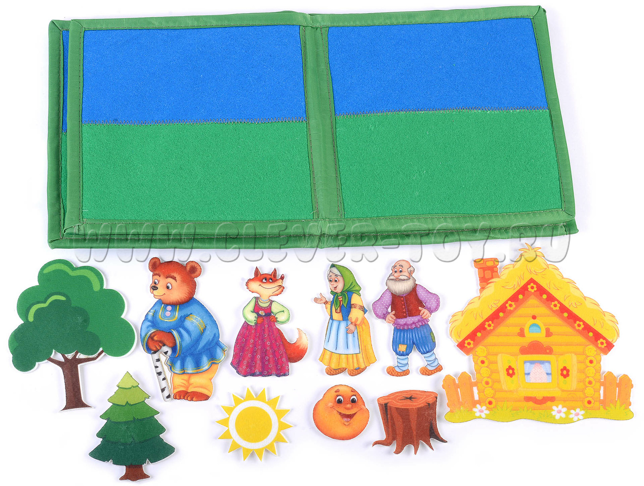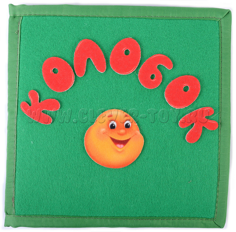 Все фигуры на липучках выполнены из ковролина. Это качественный современный материал. По составу является более плотным, чем известный фетр, поэтому он совсем не мнется, не рвется во время игры, хорошо и надолго сохраняя форму игровых элементов. Яркие фигуры любимых героев сказки «Колобок» - интересные, разнообразные, абсолютно безопасные.