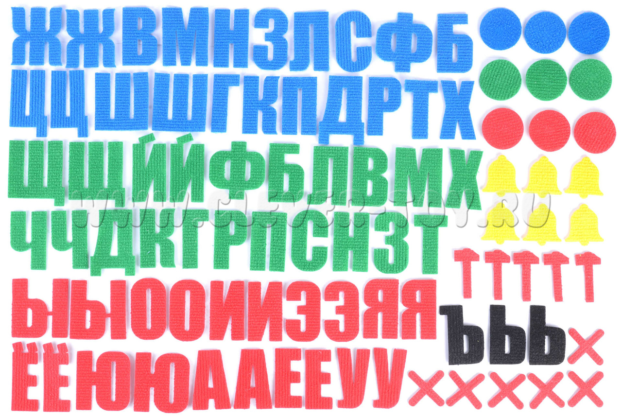 • набор синих согласных букв и знаков из ковролина (буквы Б, В, Г, Д, З, К, Л, М, Н, П, Р, С, Т, Ф, Х - по 1 шт, Ж, Ц, Ш - по 2 шт, кружки-буквозаменители (диаметр 5 см) - 3шт),