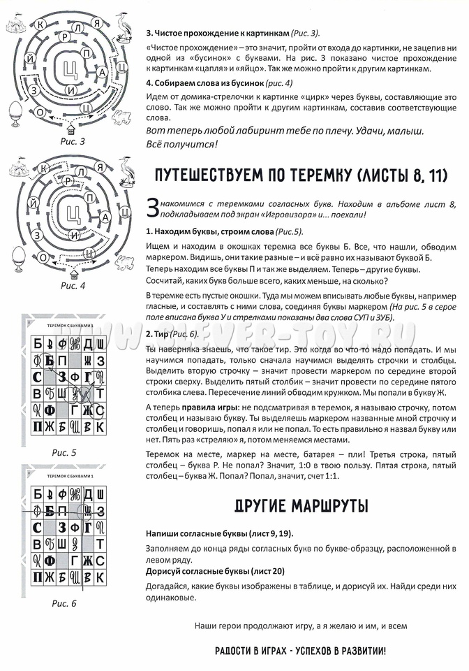 В Лабиринтах помещены главные согласные буквы (в центре), с которых начинаются слова и буквы (гласные и согласные), из которых эти слова состоят. Следуя по Лабиринтам, ребёнок учится узнавать буквы и составлять слова.