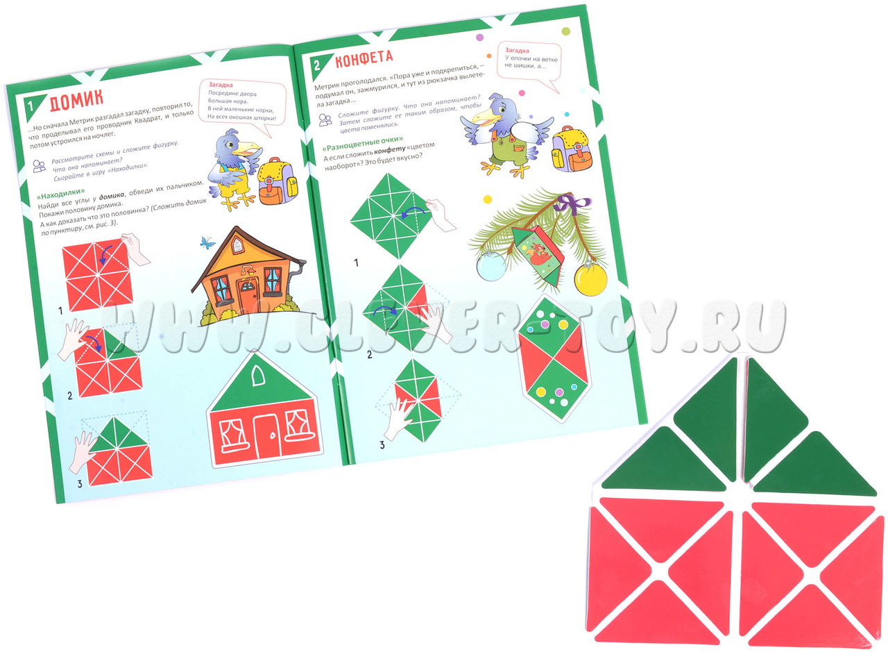 • К примеру, ребёнок сможет превратить «Квадрат» в домик, конфету, летучую мышь, звёздочку, башмачок, птичку, башенный кран и т.д.В инструкции есть условные обозначения, которые помогут ребёнку правильно выполнять задания;