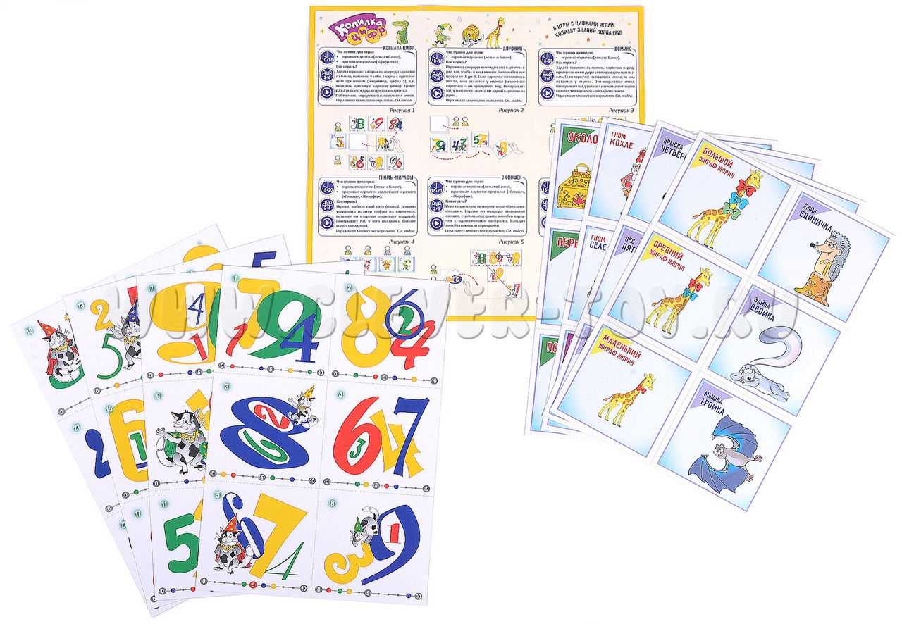 - 48 картонных карточек (105х100 мм): 24 игровых с цифрами (от 1 до 9), 24 призовых, обозначающих цвет, размер, положение (предлог),