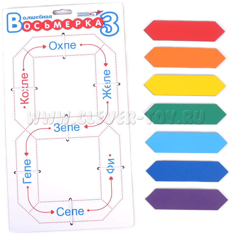 - игровое поле из дерева для конструирования одной цифр. Палочки цифры закрепляются под резинкой. На местах, где должны располагаться палочки (выделены пунктиром) написаны слова считалок на запоминание цветов радуги;