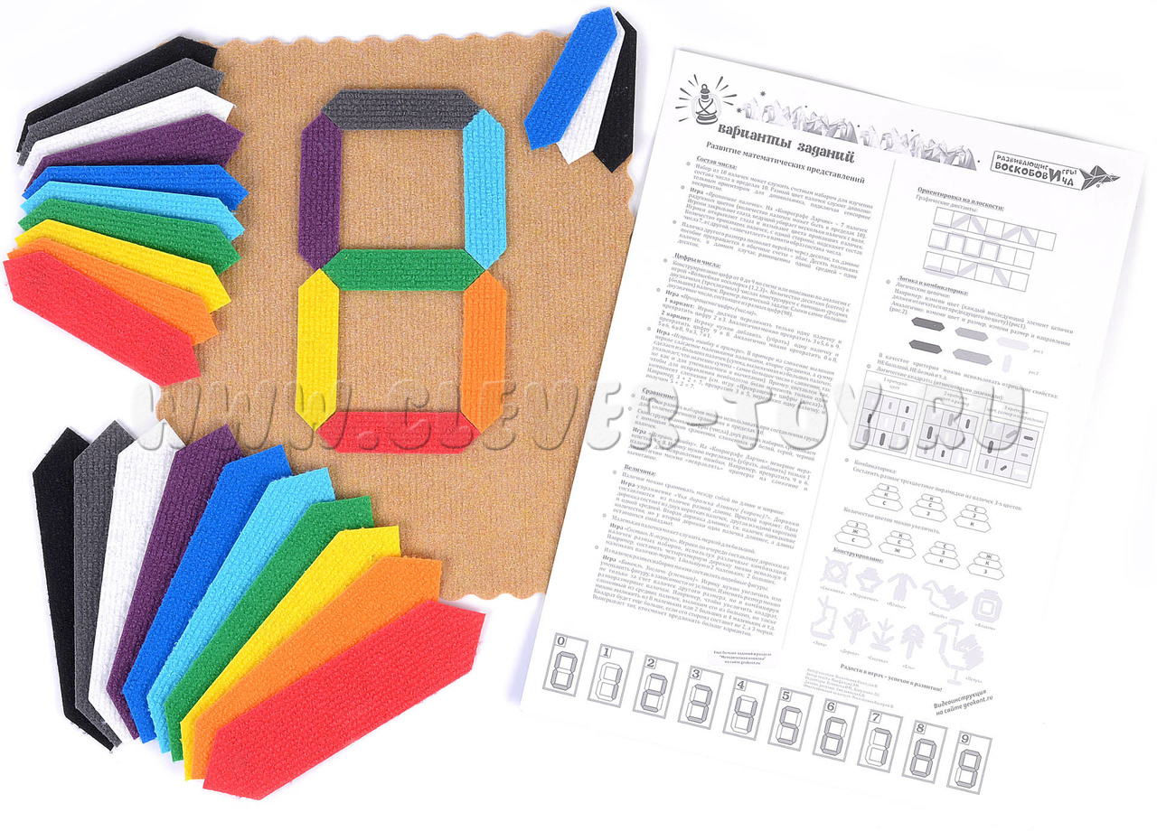 • три набора по 10 разноцветных односторонних палочек (радужные цвета + белый, серый, чёрный), палочки отличаются по величине (маленькие – 10 см., средние 14 см., большие 20 см.);