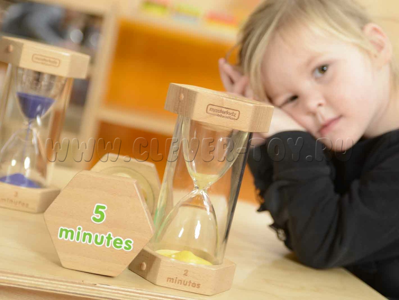Каждый таймер заполнен песком разного цвета (красный, желтый, фиолетовый, зеленый). Минуты прописаны на английском языке.