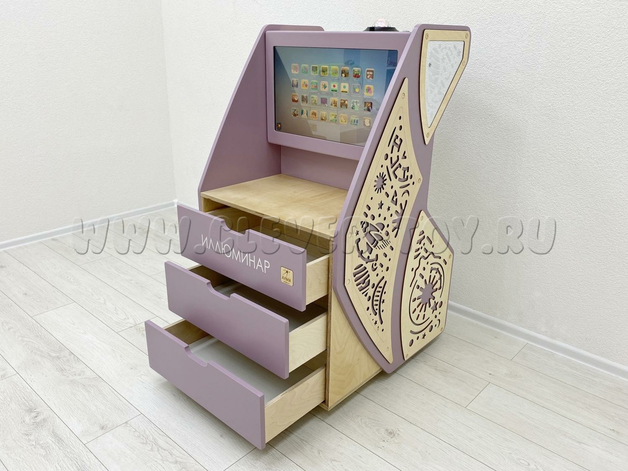 Универсальное оборудование для оснащения сенсорных комнат и кабинетов детских психологов. Мобильный комплекс включает: мультимедийную сенсорную панель с профессиональным ПО «Профиль психолога АЛМА», световую колонну, фонтан из фибероптического волокна, сенсорные панели, нейротренажёры, проектор звёздного неба и встроенную музыкальную систему.