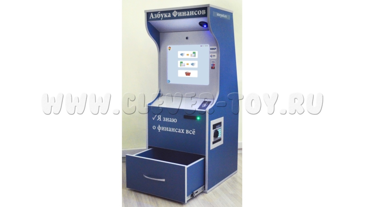 В отличие от мобильных версий комплекса "Азбука Финансов»" данная модель включает условно-мобильный банкомат, который оборудован высокопроизводительным компьютером и монитором. Это не только усиливает реалистичность образовательных игр и занятий по финансовой грамотности, но и обеспечивает возможность автономного использования всего комплекса без необходимости подключения к интерактивной доске, благодаря встроенному монитору банкомата.