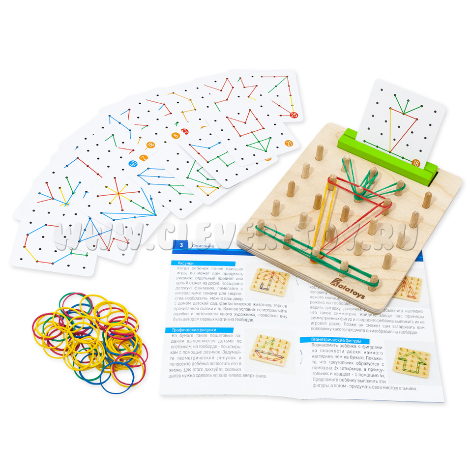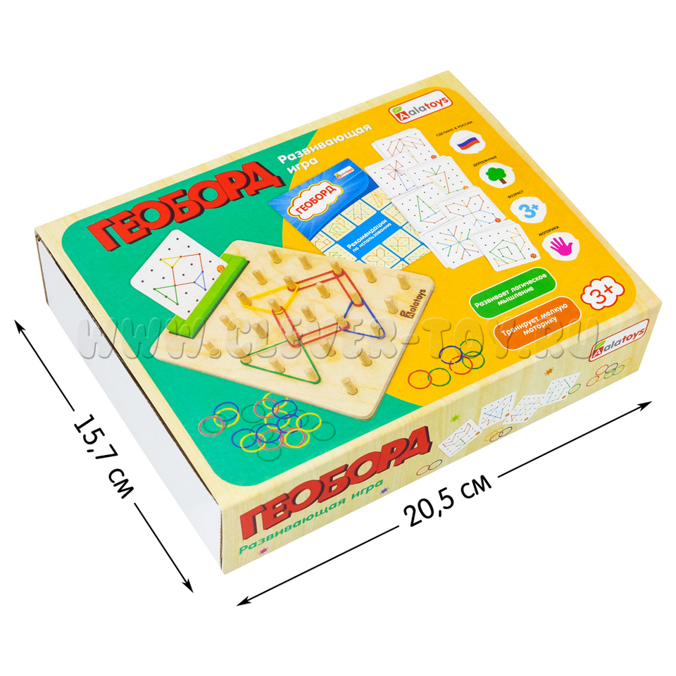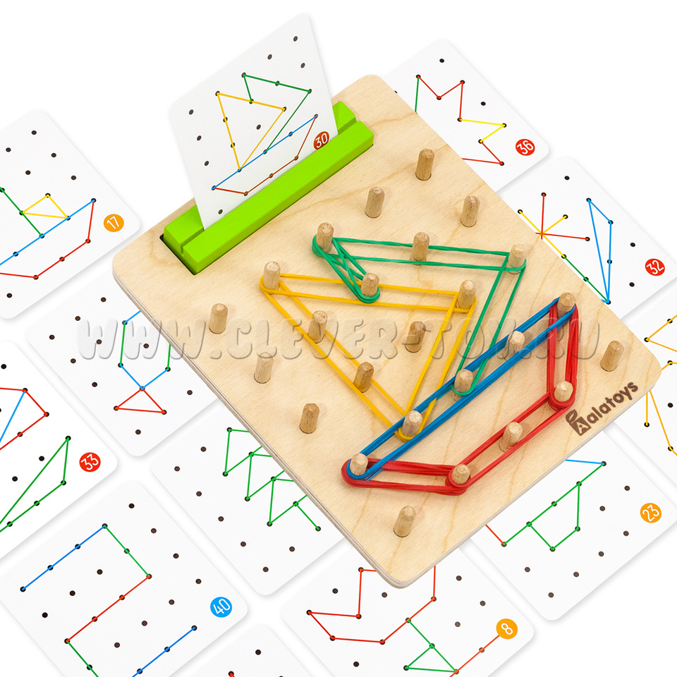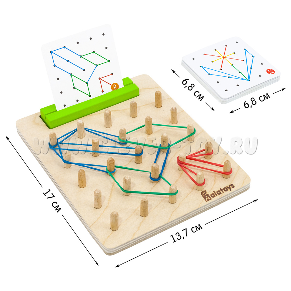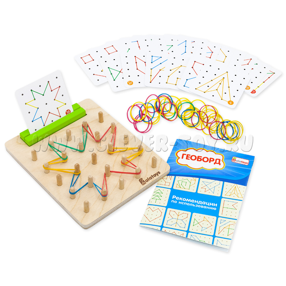 Геоборд с резинками – развивающая деревянная игрушка. Геоборд представляет собой доску со штырьками для натягивания резинок между ними, теперь с подставкой для карточек с заданиями и в яркой полноцветной коробке. Уникальная особенность игрушки – свободная игра, в которой ребенок сам придумывает последовательность действий и меняет сюжет и ход игры с помощью резинок. Тким образом, геоборд – это математический планшет, игрушка для развития навыка речи и сенсорного восприятия одновременно.