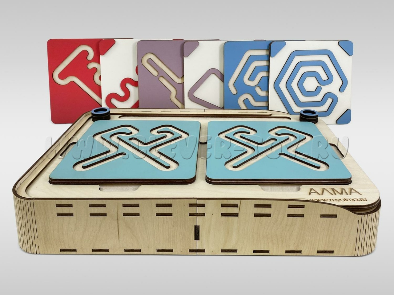 Два лабиринта с изображениями, расположенными симметрично, вставляются в пазы, и ребёнок проходит их с помощью специальных пальчиковых фишек.