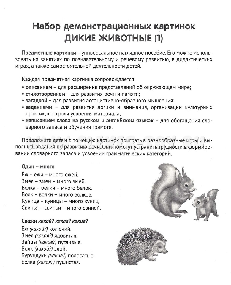 Состав комплекта (16 карточек): Барсук, Белка, Бобр, Бурундук, Волк, Выдра, Горностай, Горный баран, Дикая свинья, Ёж, Заяц, Змея, Зубр, Косуля, Крот, Куница
