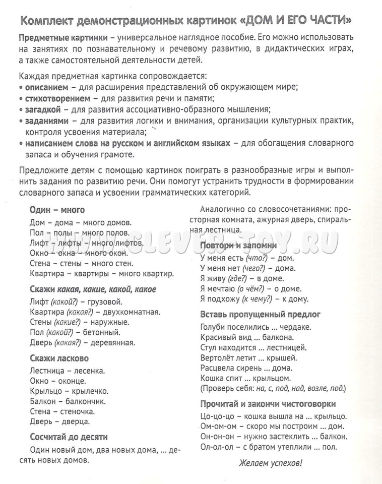 16 демонстрационных картинок для познавательного и речевого развития. На обороте каждой предметной картинки - описание дома и его частей, стихотворение, загадка, вопросы для ребёнка, название животного на русском и английском языках.