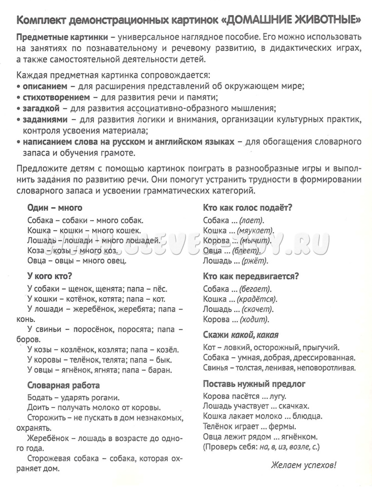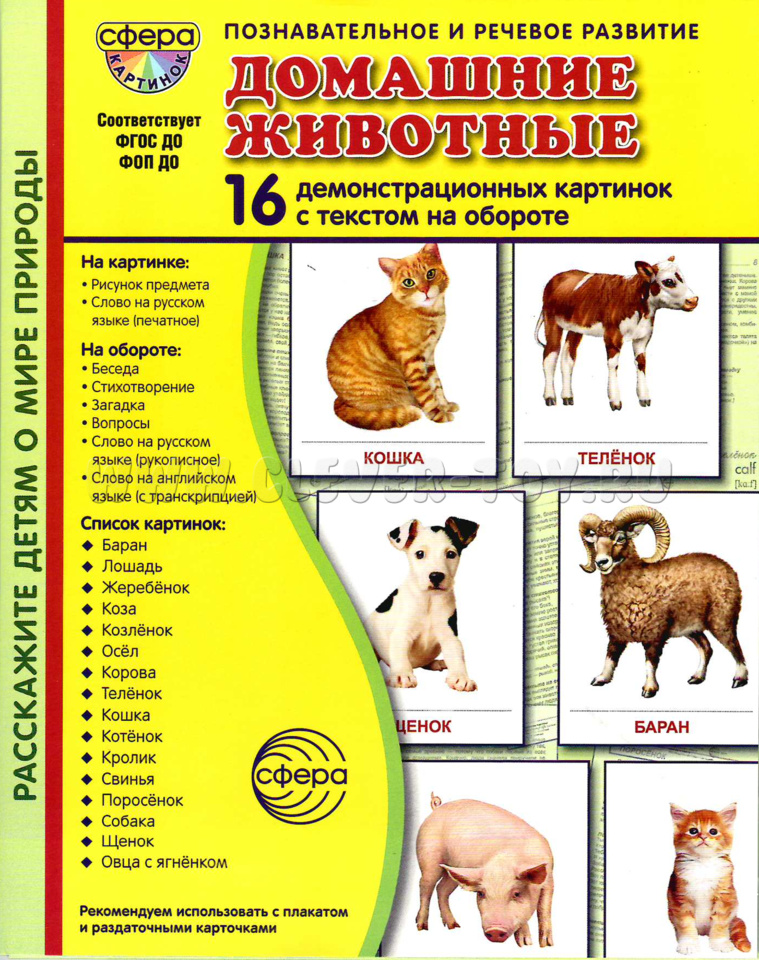Состав комплекта (16 карточек): Баран, лошадь, жеребёнок, коза, козлёнок, осёл, корова, телёнок, кошка, котёнок, кролик, свинья, поросёнок, собака, щенок, овца с ягненком.