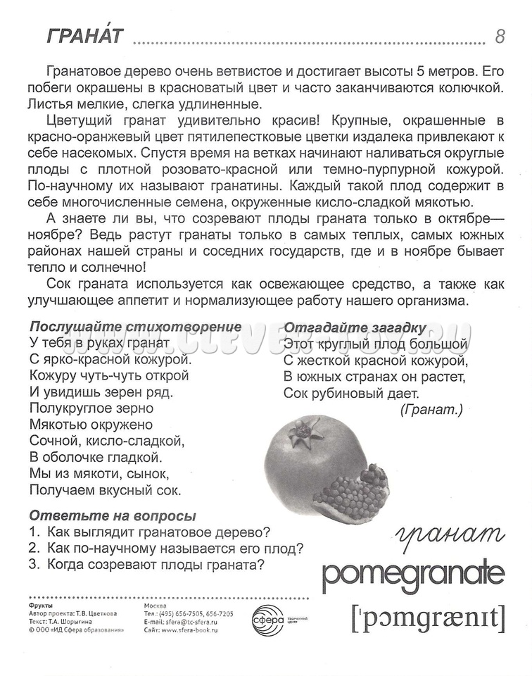 На лицевой стороне каждой карточки дается красочное цветное изображение цветка, на обратной - подробное описание, из которого дети узнают немало интересного. Для лучшего закрепления материала представлены оригинальные стихотворения и рифмованные загадки по теме, а также вопросы, на которые ребенок ответит после изучения материала или беседы со взрослым.