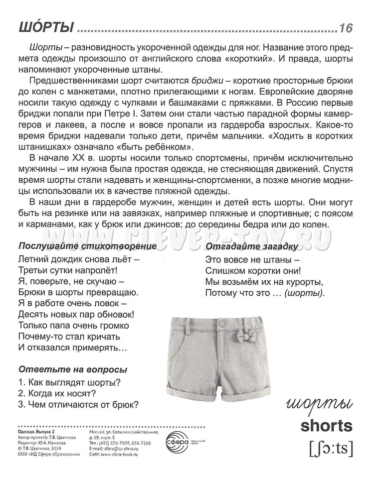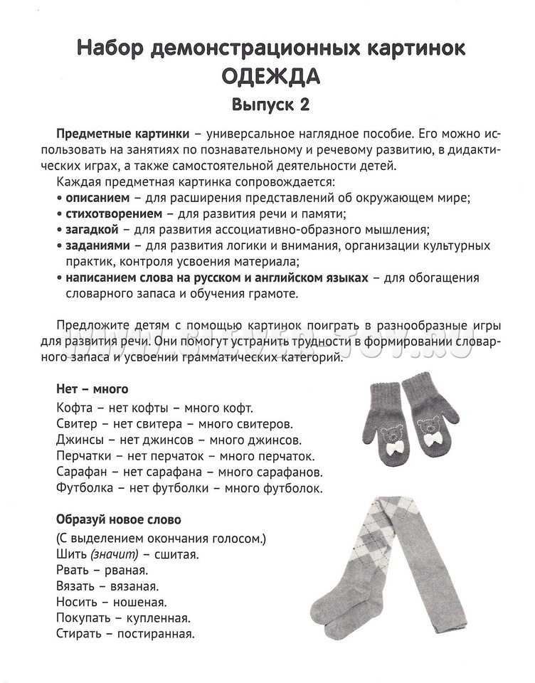 Набор карточек "Одежда. Выпуск 2" состоит из 16 цветных демонстративных карточек (картинок) и адресован детям, желающим познакомиться с видами одежды.