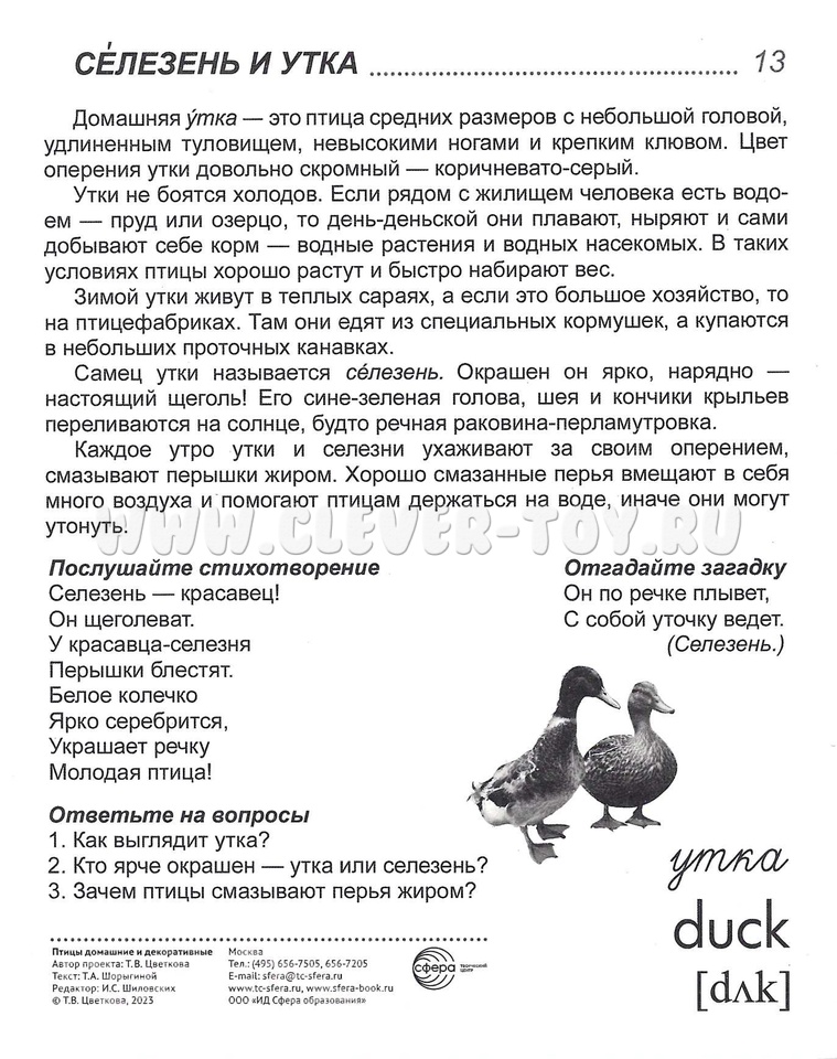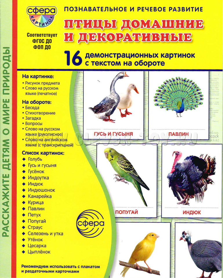 Набор карточек "Птицы домашние и декоративные" состоит из бесед, стихотворений, загадок и вопросов по теме. Комплект включает 16 цветных демонстрационных картинок с текстом на обороте, названия тем имеют перевод на английский язык.