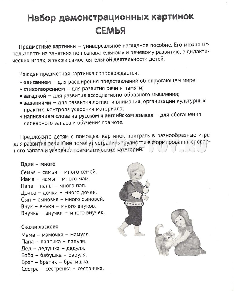 8 демонстрационных картинок для познавательного и речевого развития. На обороте каждой предметной картинки - описание, стихотворение, загадка, вопросы для ребёнка, название на русском и английском языках.