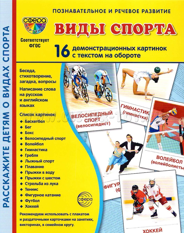 Список картинок: Баскетбол, Бег, Бокс, Велосипедный спорт, Волейбол, Гимнастика, Гребля, Лыжный спорт, Плавание, Прыжки в воду, Прыжки с шестом, Стрельба из лука, Теннис, Фигурное катание, Футбол, Хоккей.