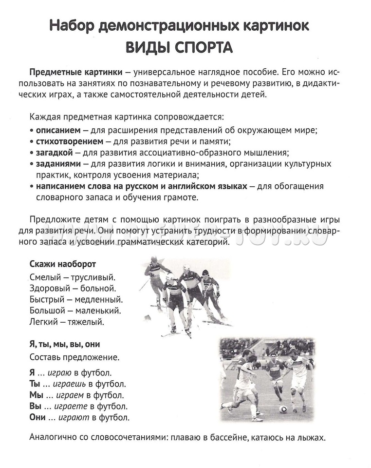 Каждая предметная картинка сопровождается: описанием - для расширения представлений об окружающем мире; стихотворением - для развития речи и памяти; загадкой - для развития ассоциативно-образного мышления; заданиями - для развития логики и внимания, организации культурных практик, контроля усвоения материала.