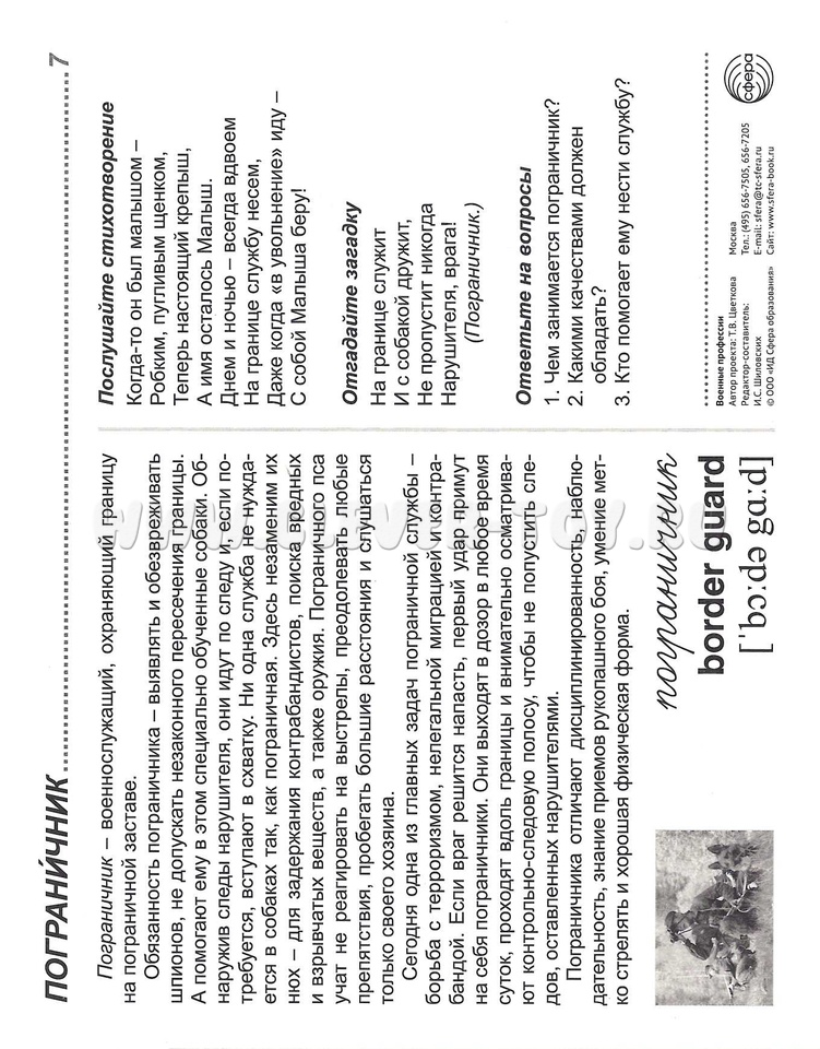 На лицевой стороне каждой карточки дается цветное изображение военнослужащего определенной военной специальности, на обратной - подробное описание, из которого дети узнают немало важных фактов о военной службе и образцах вооружения. Для лучшего закрепления материала представлены оригинальные стихотворения и рифмованные загадки по теме, а также вопросы, на которые ребенок ответит после изучения материала или беседы со взрослым.