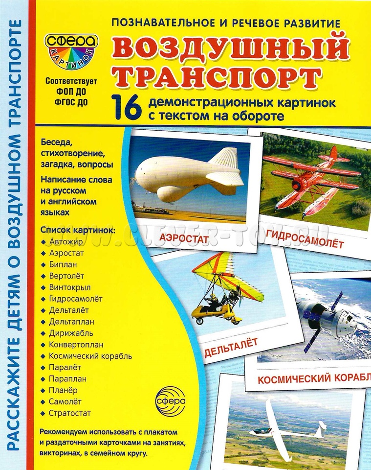 Комплект карточек "Воздушный транспорт" состоит из 16 цветных демонстрационных карточек (картинок) и адресован детям, желающим познакомиться с видами воздушного транспорта. Дошкольники и младшие школьники узнают об особенностях самых разных летательных аппаратов, историей их создания, познакомятся с их предназначением и техническими характеристиками.
