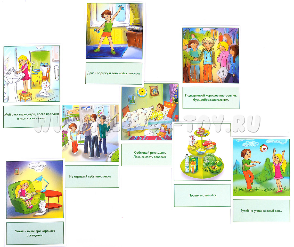 Наглядные карточки с детально прорисованными, яркими картинками познакомят ребёнка с основными правилами ЗОЖ: