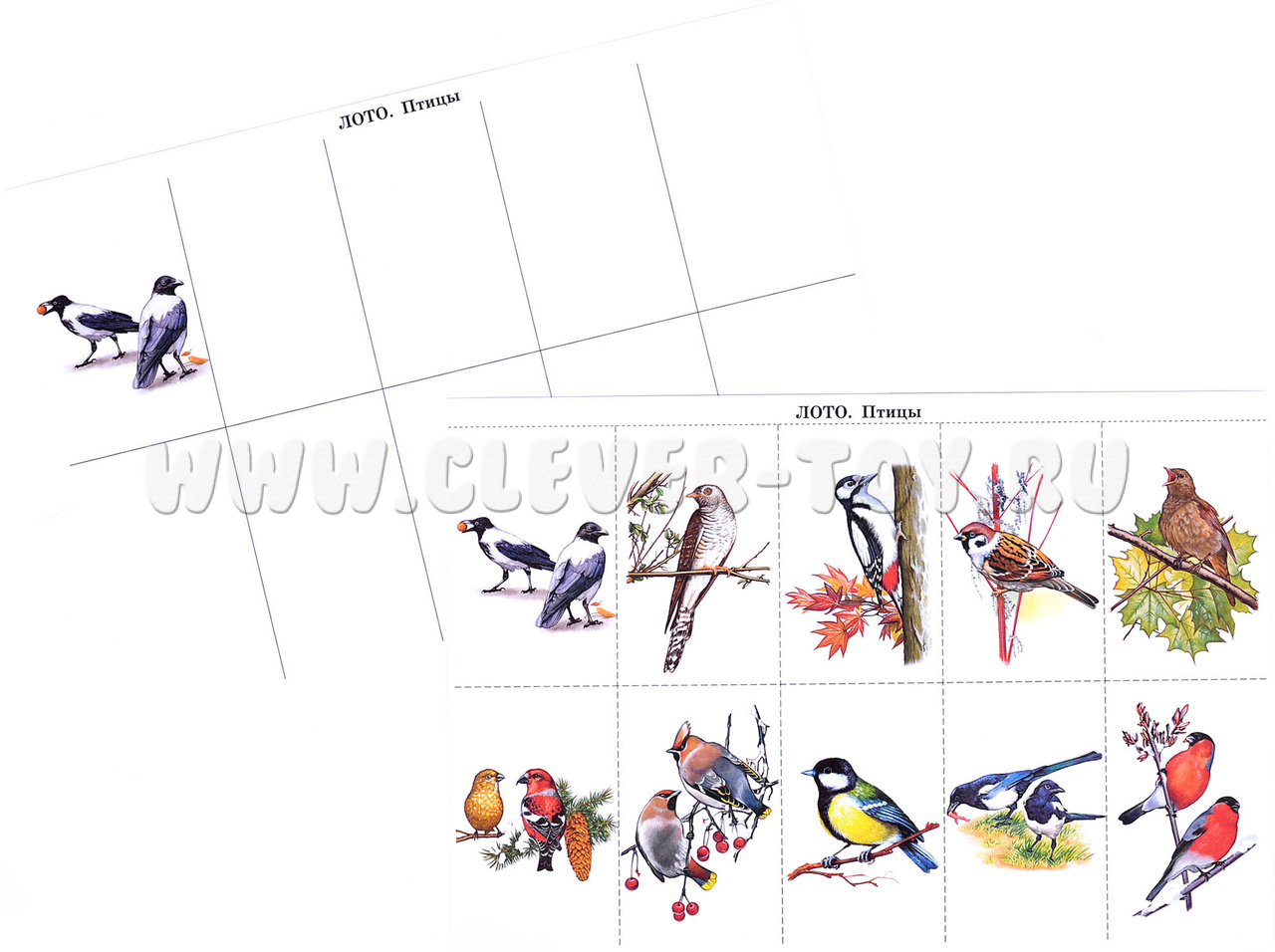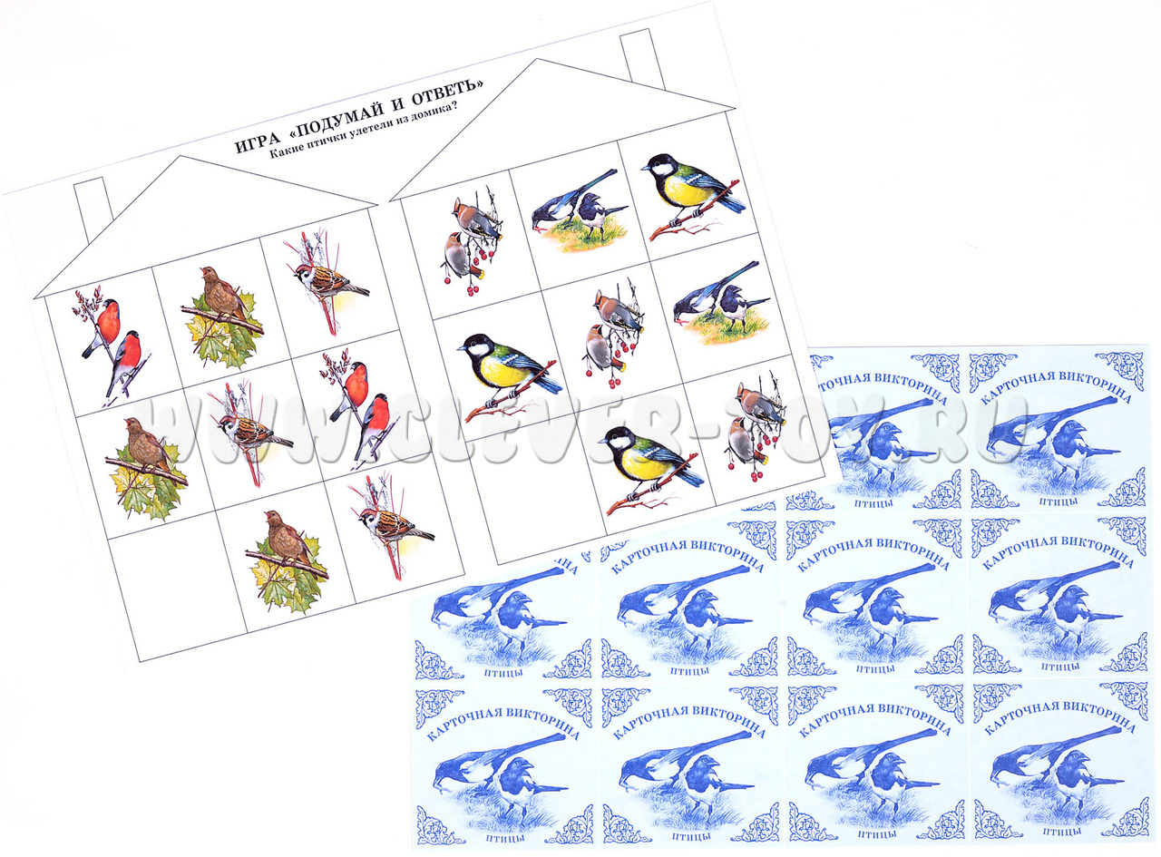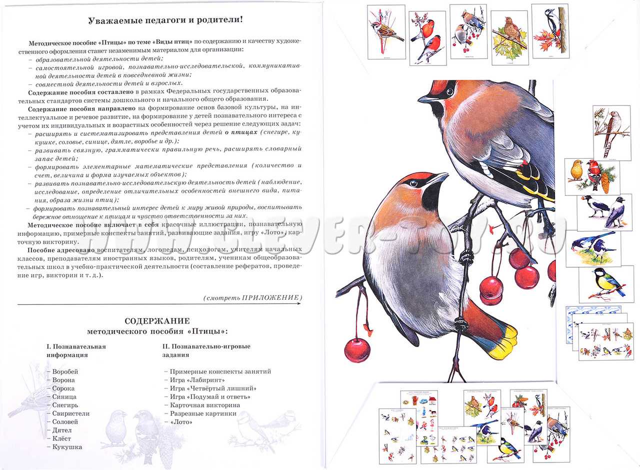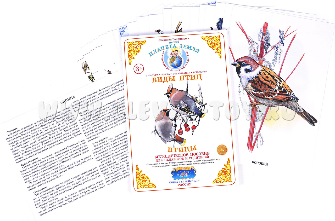 • 10 реалистичных изображений птиц разных видов, на обороте - описание, ареал обитания, особенности поведения, питания, интересные факты;