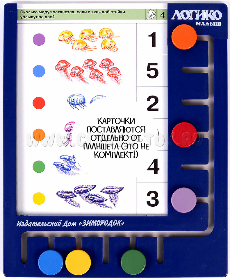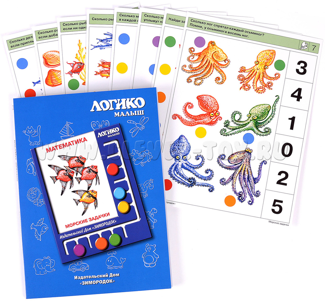 Как правило, к 6–7 годам ребёнок уже может правильно и творчески решать простейшие арифметические задачи. Задания комплекта объясняют логическую структуру задачи (условие, вопрос, решение, ответ), благодаря чему ребёнок осмысленно различает все вышеупомянутые логические звенья задачи, выбирает нужные арифметические операции (при этом в задачах на 2 действия соблюдает правильную последовательность), понимает значение глаголов, указывающих в задаче на увеличение или уменьшение количества (приплыли-уплыли), различает смысл вопросов (Сколько будет? Сколько было? Сколько осталось? На сколько меньше?). Примеры заданий в карточках: 1а. Сколько дельфинов станет в каждой стайке, если приплывёт ещё один дельфин? 3а. Сколько рыбок станет, если приплывут ещё две? 4а. Сколько медуз останется, если из каждой стайки уплывут по две? 6а. Сколько раковин будет в каждой коллекции, если добавить к ним ещё 1 или 2. 7а. Сколько ног спрятал каждый осьминог?