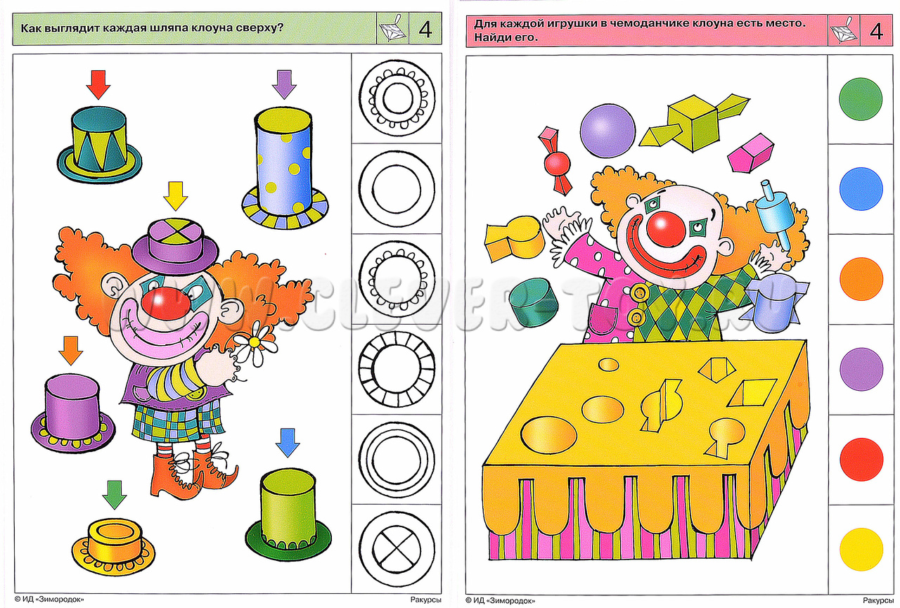 Задания комплекта направлены на развитие пространственного мышления, воображения и даже интуиции, ведь «геометрическое мышление» является образным, чувственным мышлением. Ребёнок научится угадывать, как будут выглядеть предметы с разных сторон, обратит внимание на то, что некоторые объёмные предметы сверху или сбоку похожи на плоские геометрические фигуры. Примеры заданий в карточках: 1а. Как эти предметы выглядят сверху? 2б. Какие игрушки видит обезьянка, а какие – ты? Почему вы видите по-разному? 4а. Как каждая шляпа клоуна выглядит сверху? 5б. Найди в этих узорах следы от колёс каждого транспортного средства. 7б. Какие машины гном увидел с воздушного шара?