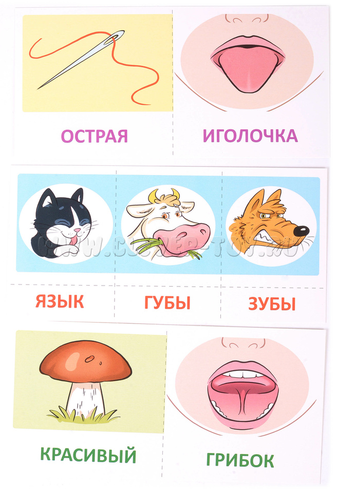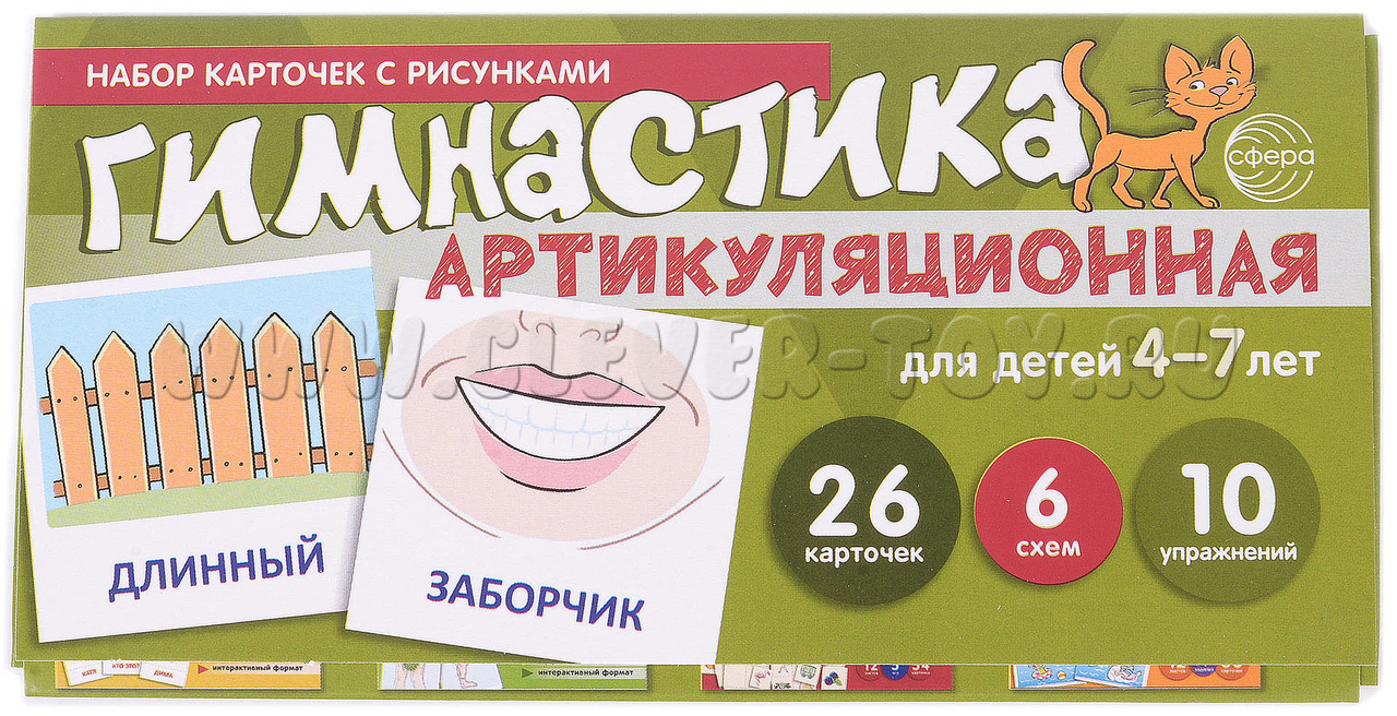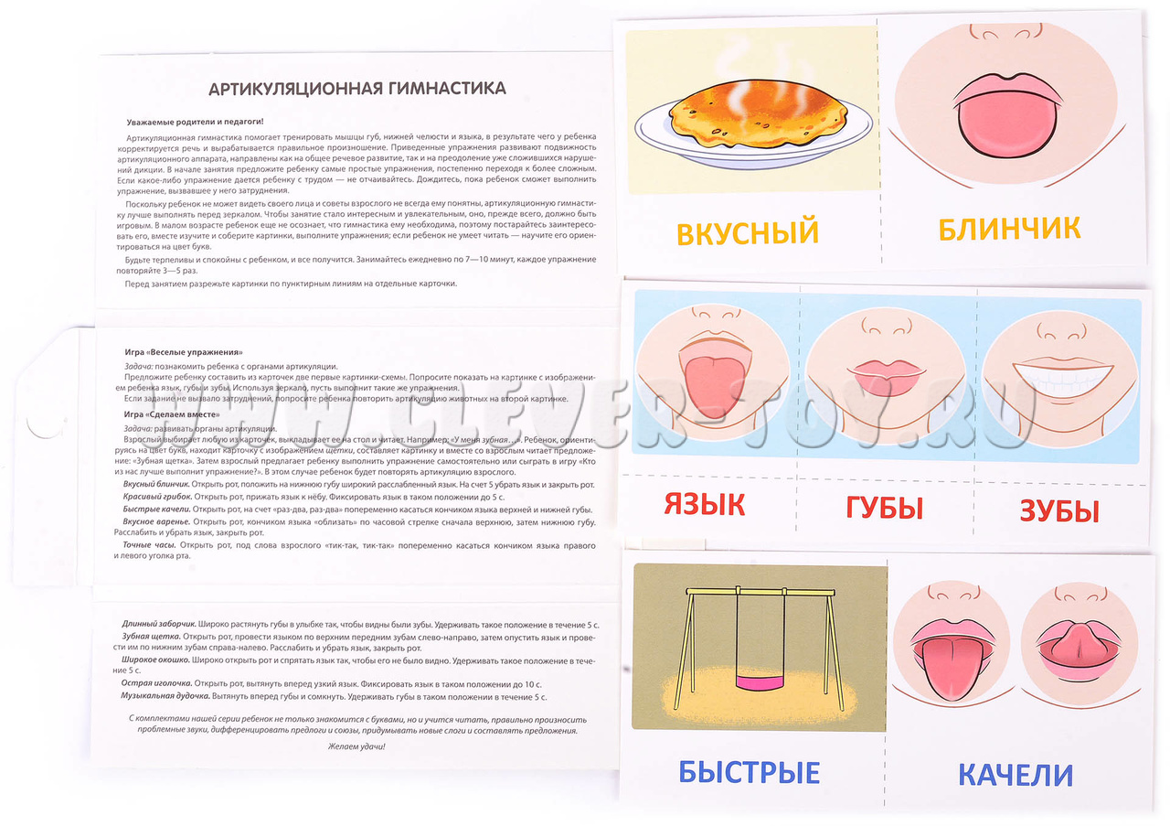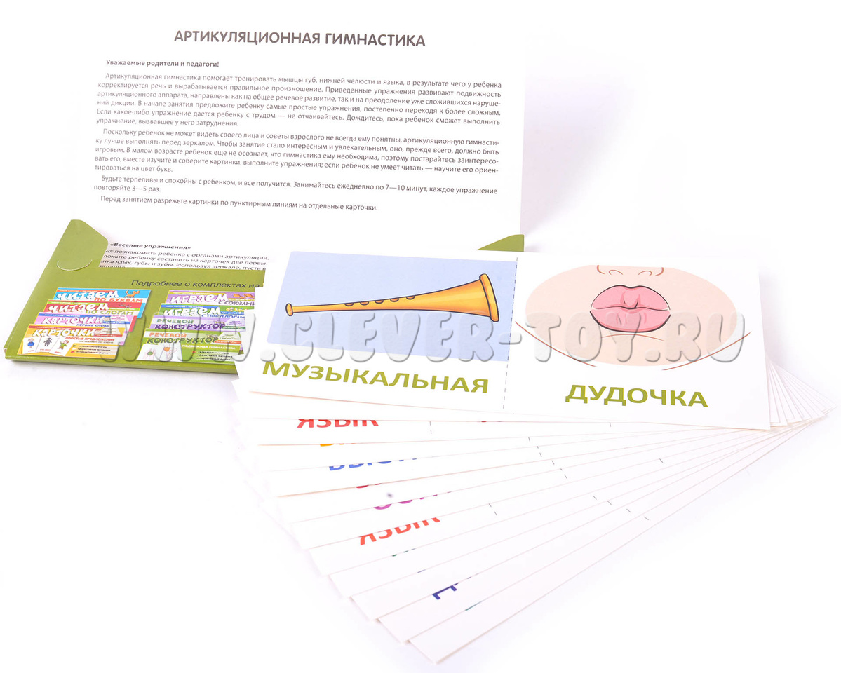 Комплект направлен на общее речевое развитие, подвижность артикуляционного аппарата и преодоление уже сложившихся нарушений дикции. В комплект входят 26 цветных карточек, 6 схем и 10 игровых упражнений. Поскольку в малом возрасте ребенок еще не осознает, что гимнастика ему необходима, взрослому нужно заинтересовать ребенка.