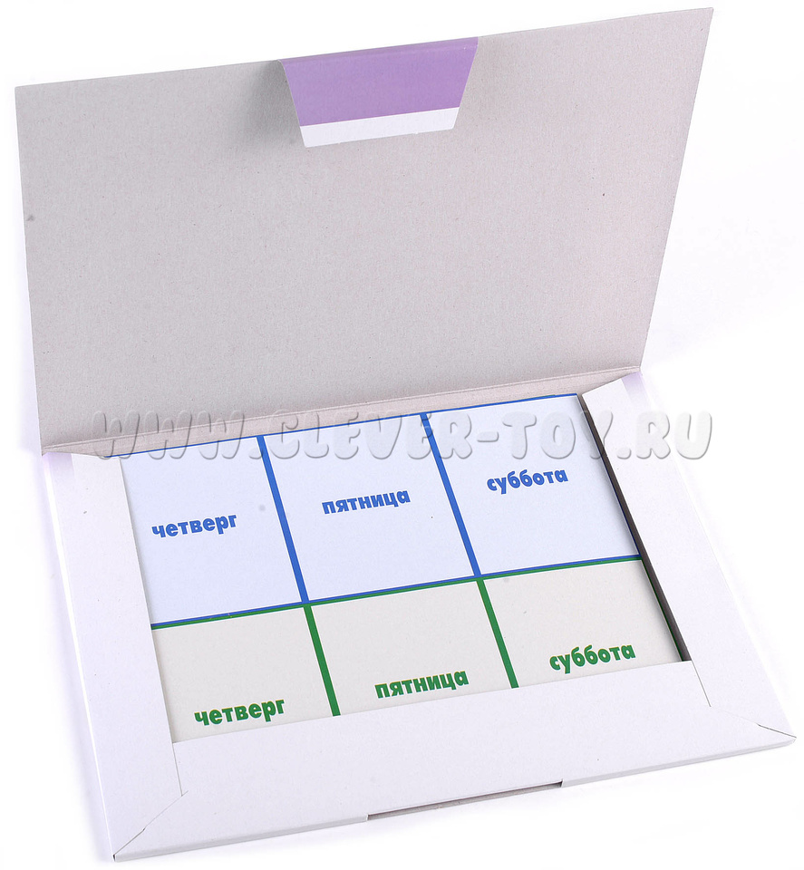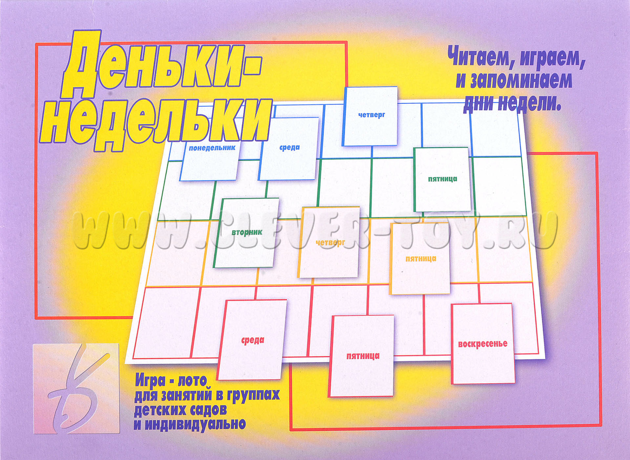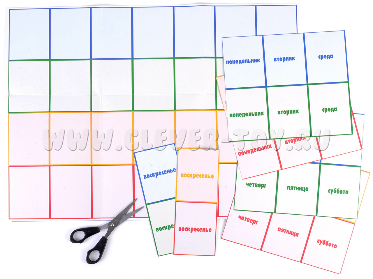 Развивающая игра-лото, которая поможет детям дошкольного возраста выучить дни недели, их последовательность. Перед началом игры требуется разрезать карты с названиями дней недели по пунктирным линиям на квадраты.