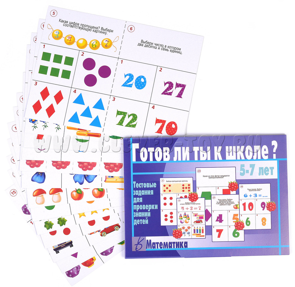 Тестовые задания для проверки знаний по математике перед поступлением в школу. Перед началом занятий требуется разрезать карты по пунктирным линиям (получится 24 карточки с заданиями и 24 с картинками).
