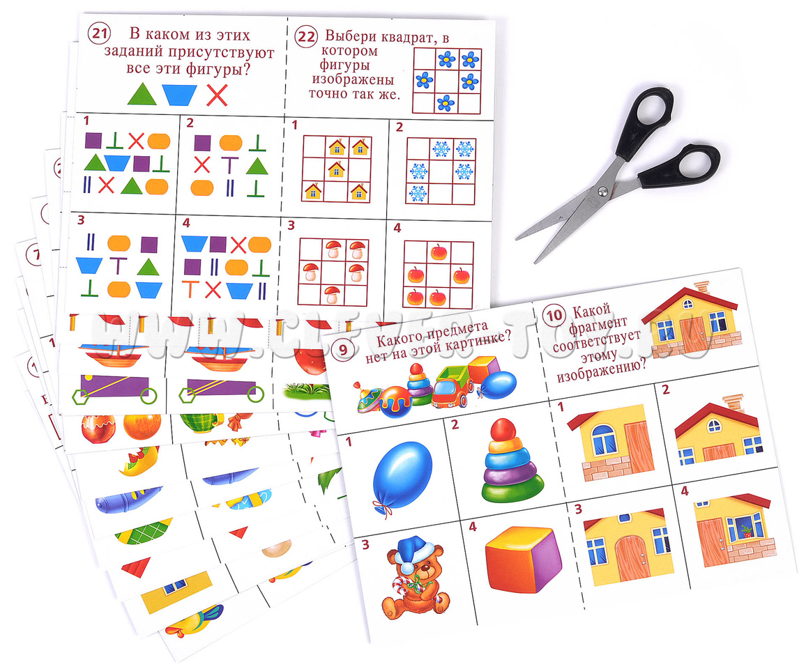 Тестовые задания для проверки знаний детей "Готов ли ты к школе? Внимание" – контрольно-измерительный материал, который проверит уровень развития внимания вашего ребенка и подготовит его к началу учебы в школе. Игра выполнена в формате картонных карточек А4 и содержит в себе тестовые задания, разделенные пунктирной линией на отдельные карточки. Каждое задание сопровождается и 4 иллюстрированными вариантами ответа – это поможет ребенку быстрее и легче усвоить материал.