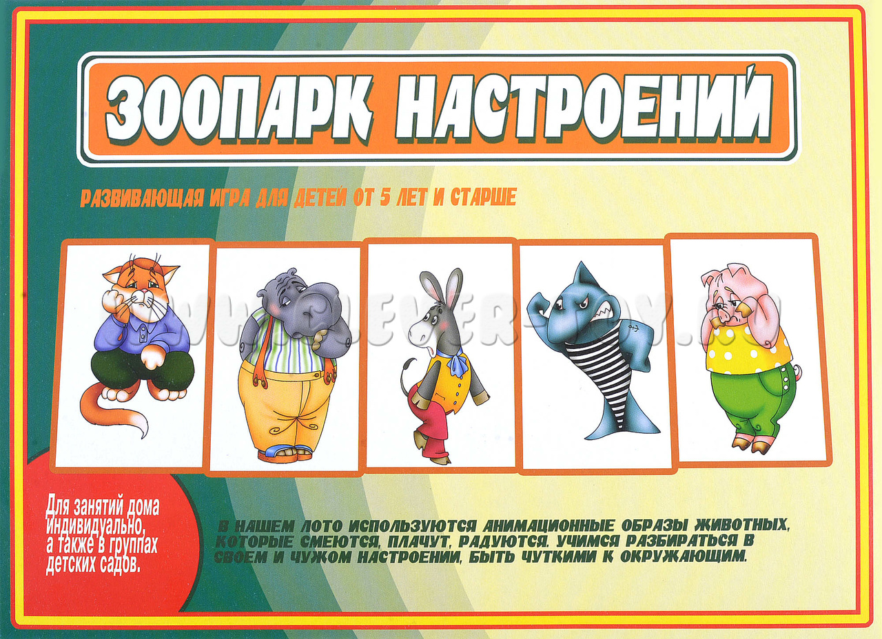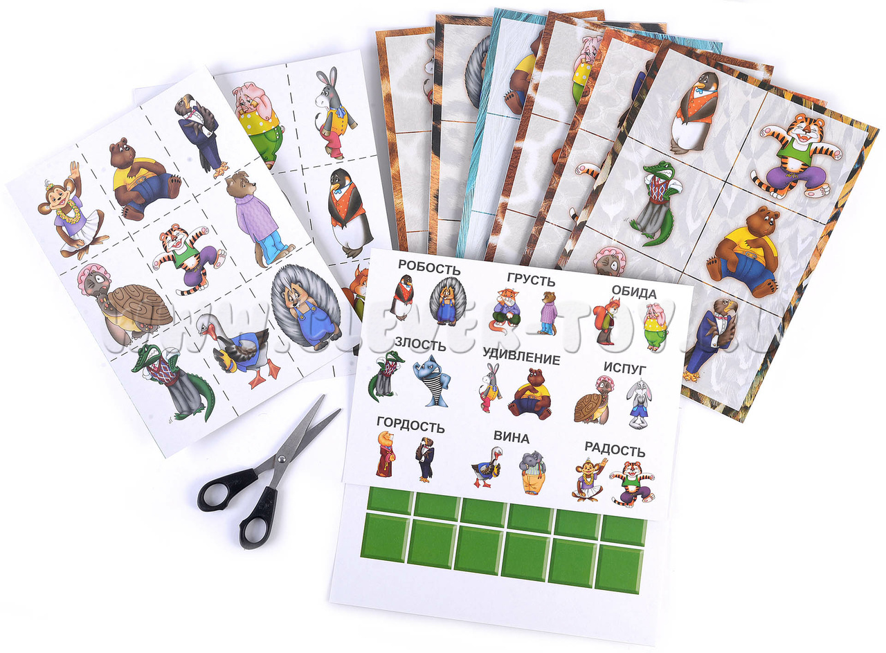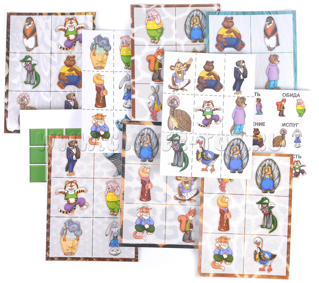 Перед началом игры требуется разрезать карты по пунктирным линиям (получится 6 игровых полей, 18 карточек с животными, лист для фишек, лист с названиями настроений). Внимательно изучите с ребенком лист с названиями настроений, проанализируйте внешний вид и эмоции животных.