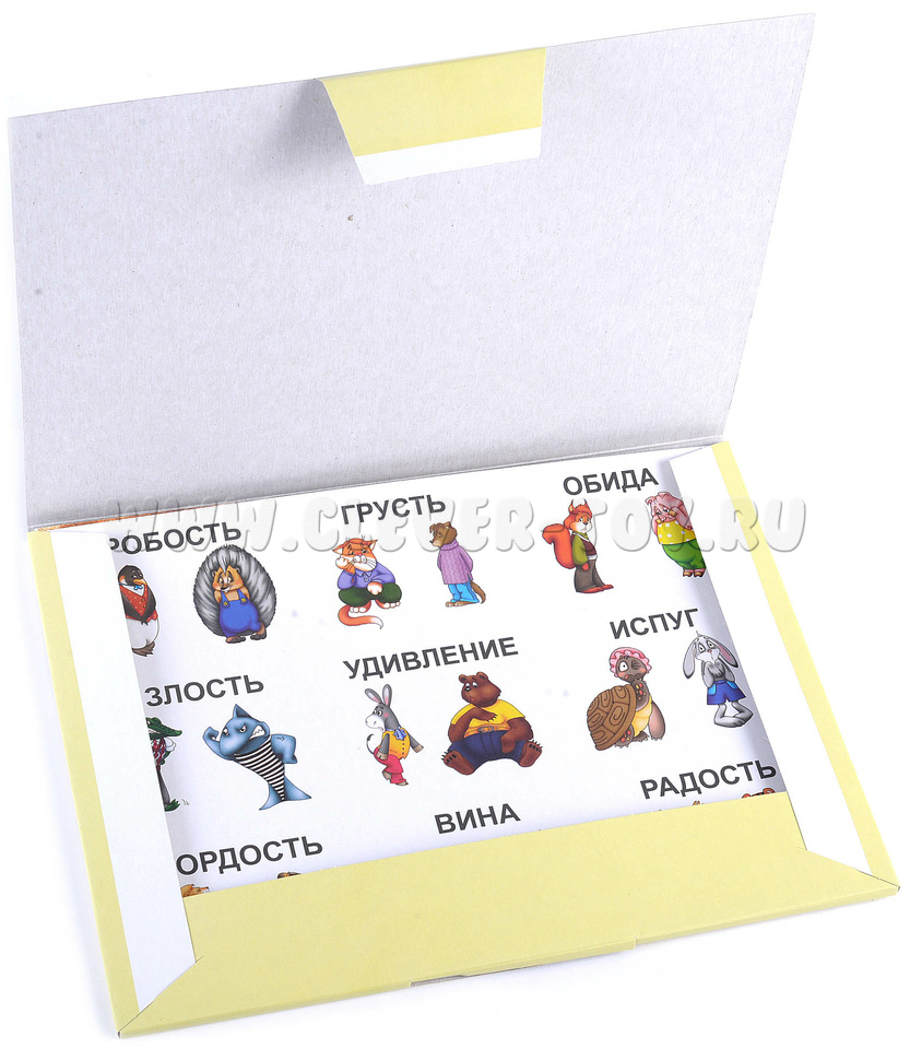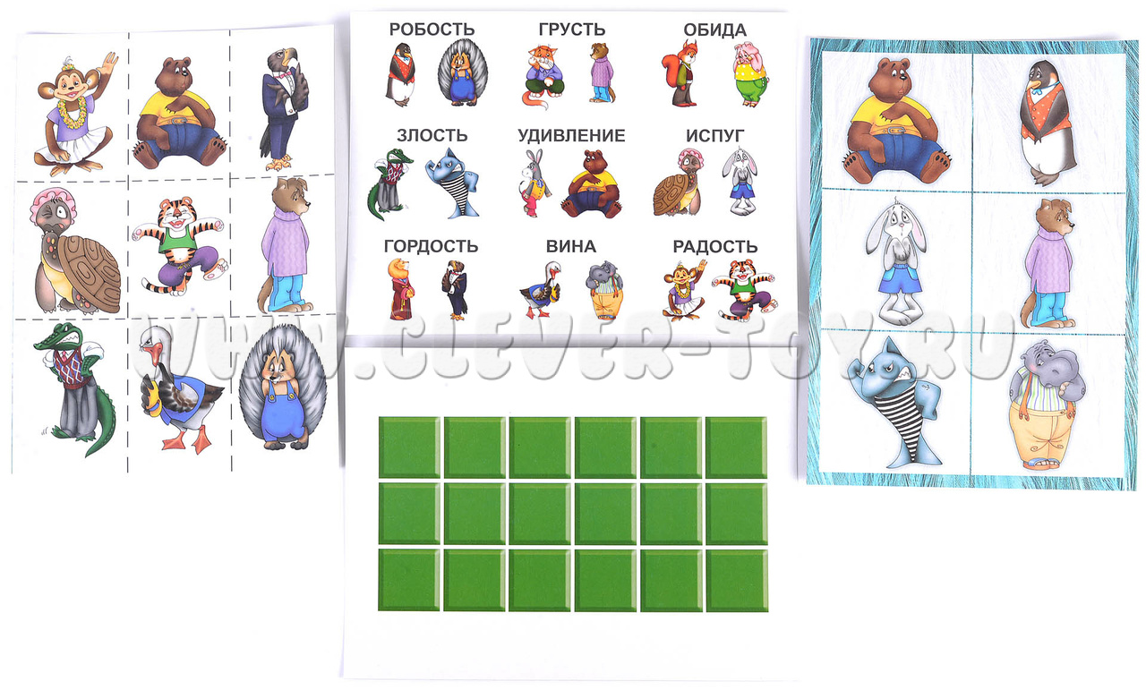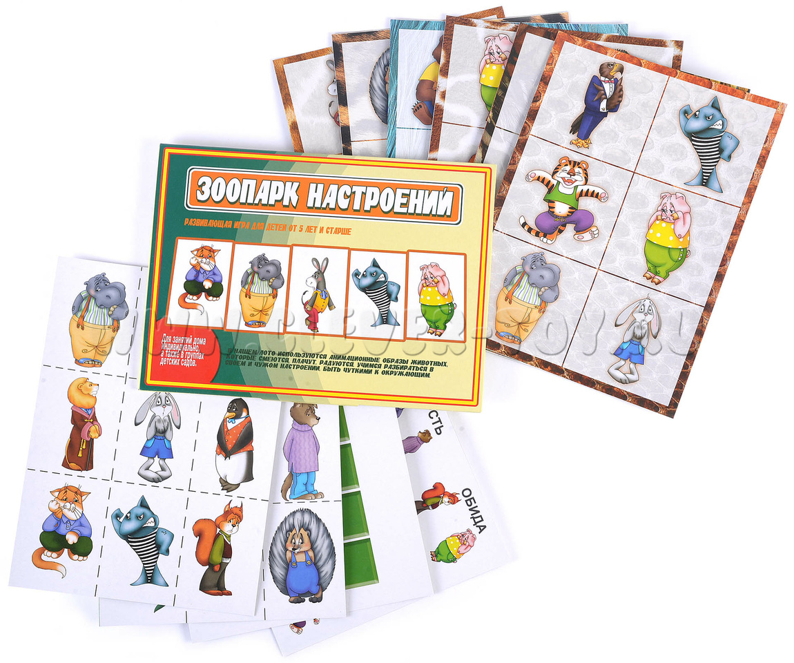 Перед началом игры требуется разрезать карты по пунктирным линиям (получится 6 игровых полей, 18 карточек с животными, лист для фишек, лист с названиями настроений). Внимательно изучите с ребенком лист с названиями настроений, проанализируйте внешний вид и эмоции животных.