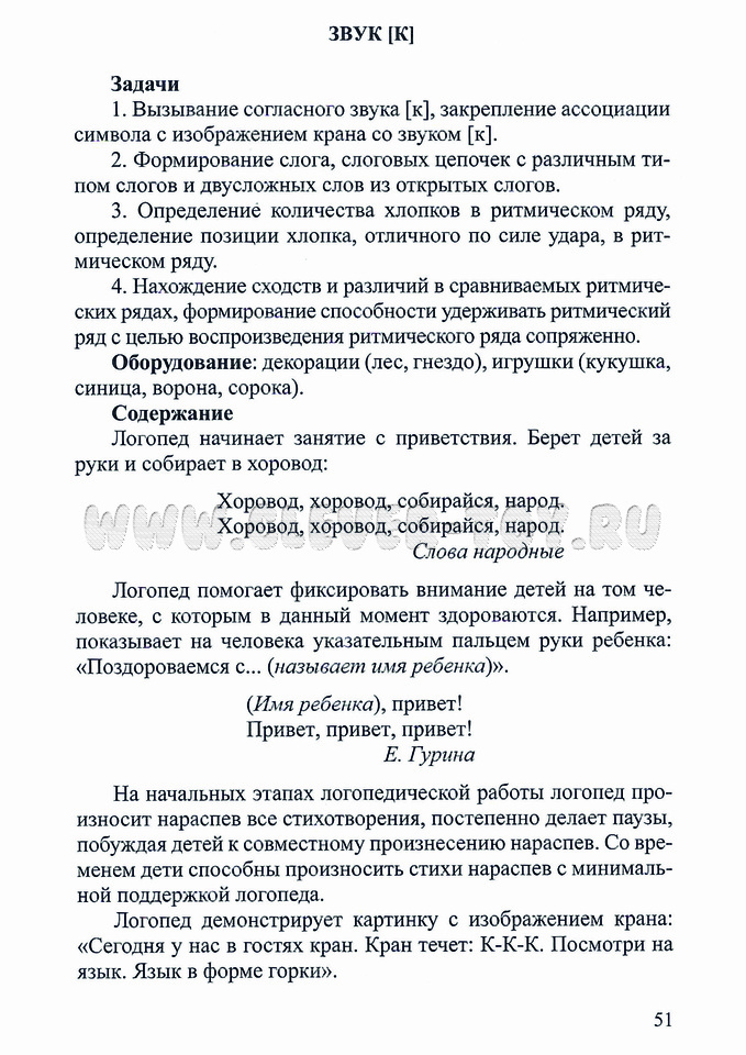 Чувство ритма имеет большое значение в онтогенезе речи. Ребенок, начиная говорить, прежде всего усваивает ритмический контур слова, понимая его смысл, но не умея еще его правильно произнести. Для проведения занятий необходимо использовать музыкальные инструменты, игрушки и т.д.