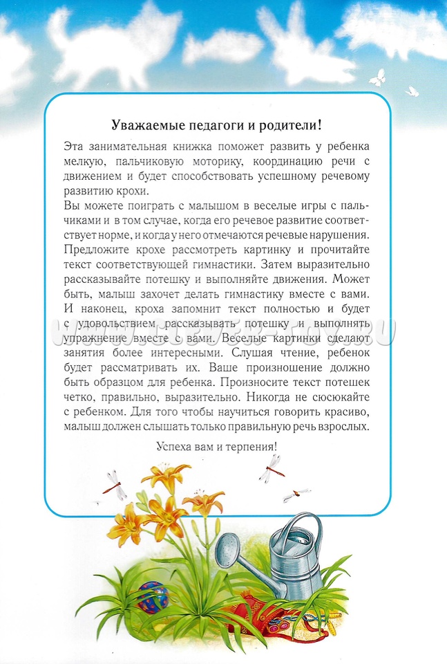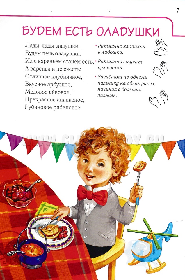 Вы можете поиграть с малышом в веселые игры с пальчиками и в том случае, когда его речевое развитие соответствует норме, и когда у него отмечаются речевые нарушения. Предложите крохе рассмотреть картинку и прочитайте текст соответствующей гимнастики. Затем выразительно рассказывайте потешку и выполняйте движения, описанных и иллюстрированных на правой стороне листа.
