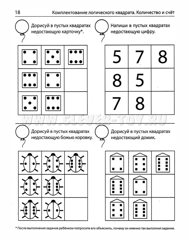 Они формулируются в виде конкретного действия с помощью глаголов: нарисуй, обведи и т.п.; имеют понятный результат, который ребёнок определяет с помощью критерия взрослого или по образцу. У него продолжают формироваться предпосылки учебной деятельности: понимание учебной задачи, самостоятельное решение и навык самоконтроля и самооценки. Логические задачи не требуют вычислений. Их решение направлено на поиск связей и отношений между отдельными предметами, явлениями, ситуациями.