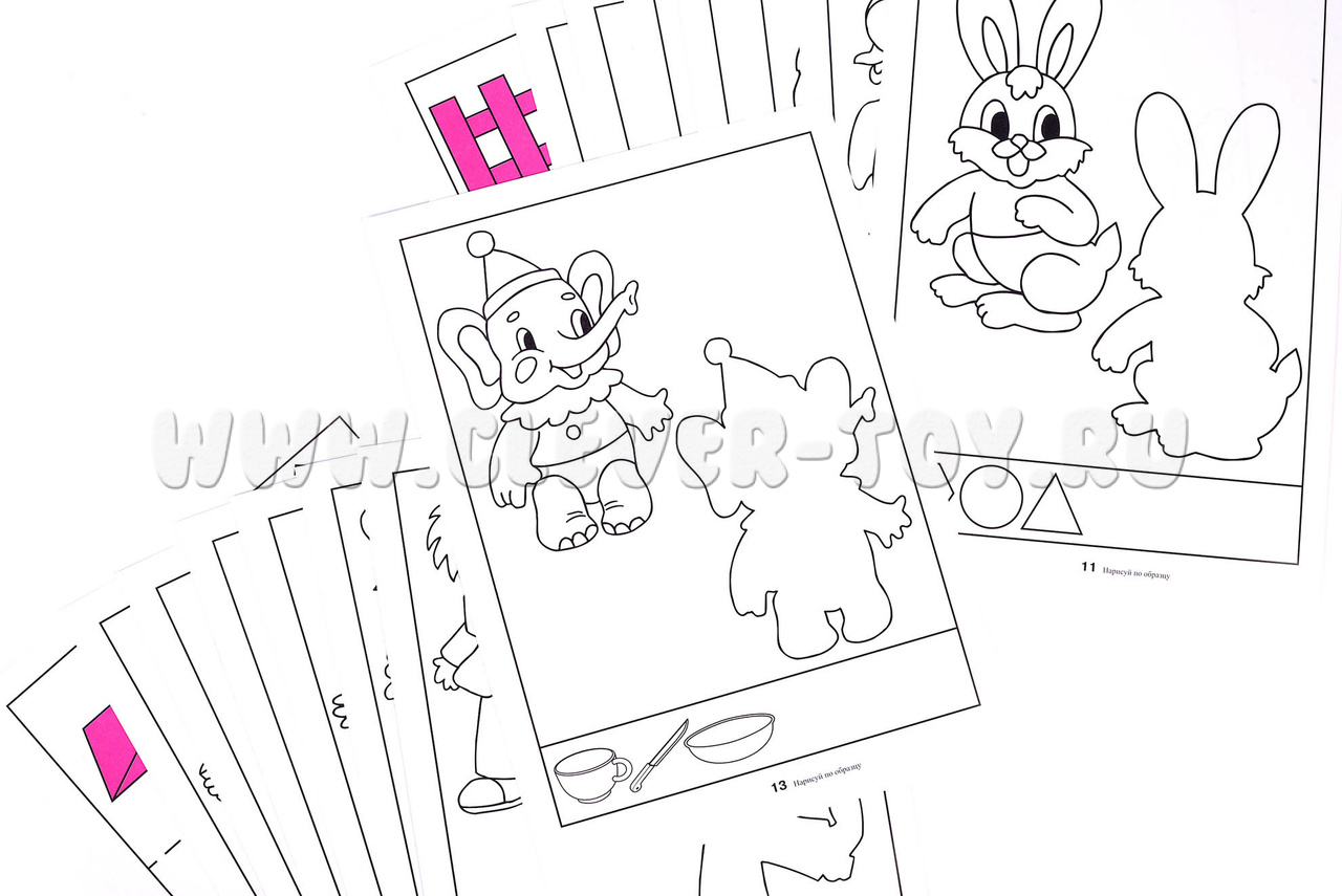 Задание для ребенка - воссоздать большой рисунок в первоначальном виде, срисовывая с образца. Внизу каждого листа есть маленькие рисунки, которые тоже необходимо полностью повторить.