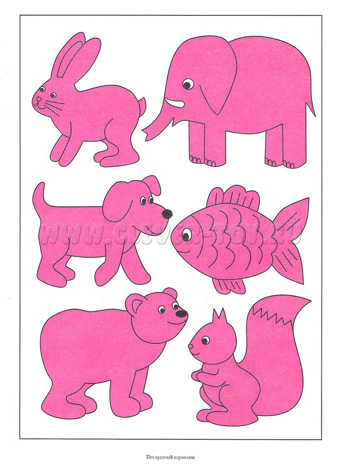 Картинки на цветном вкладыше необходимо вырезать по контуру, и тогда у вас получатся трафареты, которые можно обводить, прижав листок, а затем раскрасить получившиеся контуры.