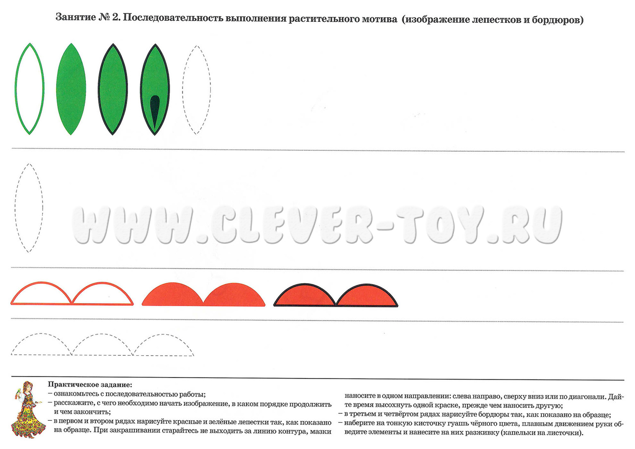 2. Последовательность выполнения растительного мотива (изображение лепестков и бордюров);